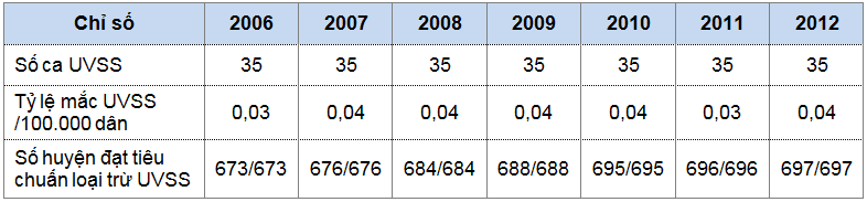 Kể từ năm 2005 (năm công bố thành công loại trừ UVSS) đến 2011, tỷ lệ mắc UVSS thường xuyên đạt 0,04/100.000 dân, và 100% số huyện trên toàn quốc đạt chỉ tiêu loại trừ UVSS của WHO khu vực Tây Thái Bình Dương đề ra.