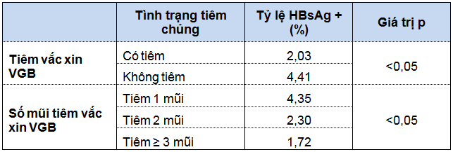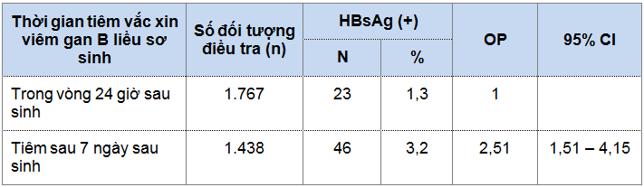 Kết quả điều tra cũng cho thấy hiệu quả của việc tiêm vắc xin VGB liều sơ sinh trong vòng 24 giờ trong việc làm giảm tỷ lệ nhiễm vi rút VGB ở trẻ em Việt Nam. Nguy cơ nhiễm HBsAg ở nhóm được tiêm chủng sớm trong vòng 24 giờ đầu sau sinh thấp hơn rõ rệt (OR: 2,51; 95% CI: 1,51-4,15) so với nhóm không được tiêm vắc xin trong vòng 7 ngày đầu sau sinh.