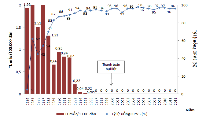 Biểu đồ 2. Tỷ lệ tiêm chủng vắc xin OPV và tỷ lệ mắc bệnh bại liệt, năm 1985 – 2012