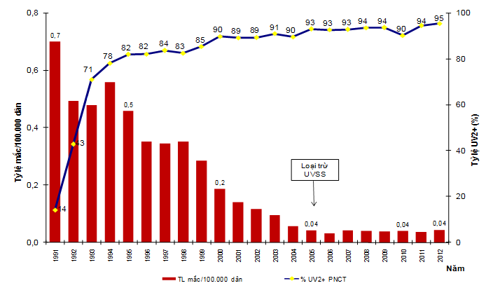 Biểu đồ 3. Tỷ lệ tiêm UV2+ ở PNCT và tỷ lệ mắc UVSS, 1991-2012