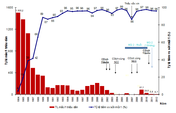 Biểu đồ 4. Tỷ lệ tiêm vắc xin sởi và tỷ lệ mắc sởi tại Việt Nam, 1984-2012