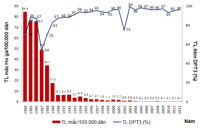 Biểu đồ 8. Tỷ lệ tiêm DPT3 và tỷ lệ mắc ho gà tại Việt Nam, 1984-2012